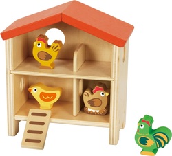 Krásny drevený domček so sliepočkami, kuriatkom a kohútikom poteší každého malého farmára alebo farmárku.