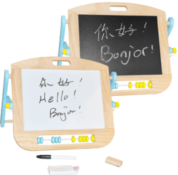 Táto obojstranná stolová tabuľa na písanie kriedou uľahčuje rozvoj kreatívnych umeleckých zručností detí. Jedna strana obsahuje magnetickú tabuľu so fixkami na suché mazanie a druhá tradičnú tabuľu.