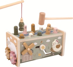 Súčasťou je veselá zatĺkačka s krtkami a drevené kladivko, s ktorým si deti precvičujú silu úderu a presnosť. Magnetická udica slúži na chytanie farebných rybičiek, čo pomáha rozvíjať trpezlivosť, koordináciu a jemnú motoriku. Nechýba ani farebný xylofón s paličkou, ktorý rozvíja hudobný sluch a zmysel pre rytmus. Vďaka mnohým rôznorodým aktivitám táto drevená hračka zabaví deti na dlhú dobu a podnecuje ich zvedavosť, logické myslenie aj zmyslové vnímanie.