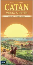 Hra Catan - Mestá a rytieri 5-6 hráčov obsahuje: 2 archy výstavby miest, 30 značiek výstavby miest, 18 kariet obchodného tovaru (6× plátno, 6× mince, 6× papier), 2 karty s výhernými bodmi, 6 hradieb, 6 nástavcov metropolí, 12 figúrok rytierov, 12 heliem a pravidlá v češtine a slovenčine.