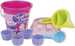 8dielna sada na piesok, vyrobená z kvalitných plastov v Taliansku.Obsahuje: vedierko, priehľadné sitko v tvare torty, lopatku, 4 formičky v tvare bábovky a jeden dekoratérsky lievik na miešanie piesku a vody a vytváranie kreatívnych muffinov a iných výtvorov.
