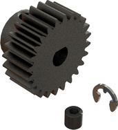 Tuningový diel pre RC modely áut Arrma 3S 4WD Bigrock, Granite, Senton, Typhon: pastorok 24T 0.8M Safe-D5. Otvor pre hriadeľ s plôškou v tvare D zaistí pevné spojenie aj keď sa uvoľní pastorok.