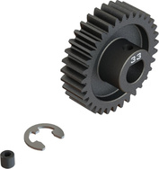 Arrma oceľový pastorok 33 zubov, modul M1, otvor Safe-D8. Otvor v tvare 'D' zodpovedá profilu hriadeľa motora s hriadeľom 8mm a drážkou, preto sa nemôže pastorok na hriadeli pretočiť. Stavacia skrutka - M4 x 4mm, segrovka 6mm. Precízne vyrobený široký profil zuba pre hladký chod.