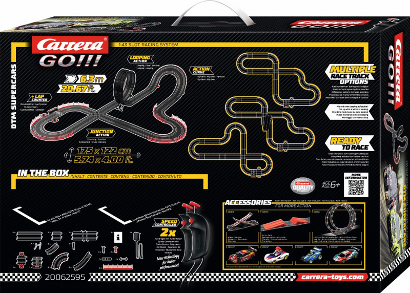 Autodráha Carrera GO!!! dlhá 6,3 m s vozidlami radu GT3 Audi R8 LMS a Lamborghini Huracán obsahuje križovatku, rovinky, zákruty, klopenú zákrutu, looping, počítadlo kôl a ďalšie časti. Môžete si postaviť ďalšie rôzne trate podľa svojej fantázie.