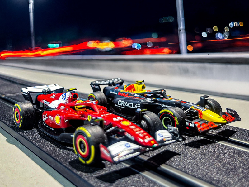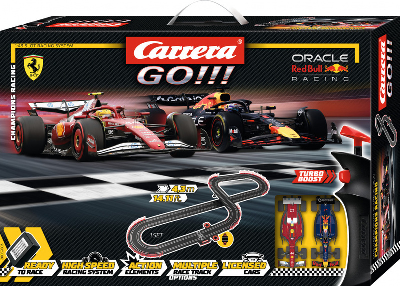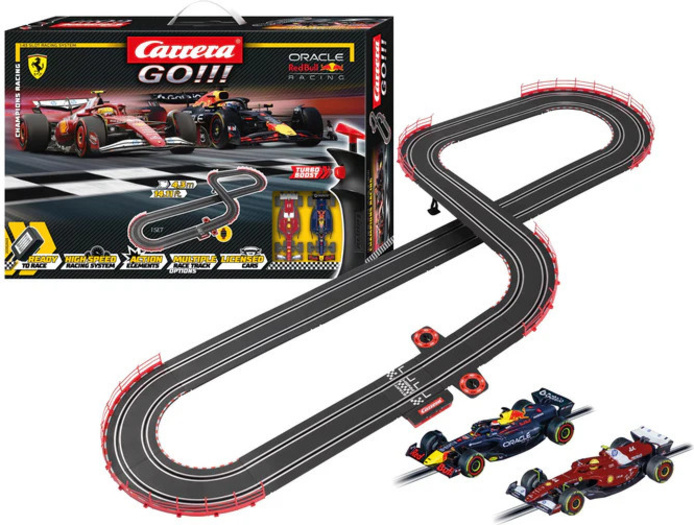 Autodráha Carrera GO!!! dlhá 4,3 m s autami F1 Ferrari a Red Bull, obsahuje premostenie, rovinky, zákruty, diel s počítadlom kôl a ďalšie časti. Môžete si postaviť ďalšie rôzne trate podľa svojej fantázie.