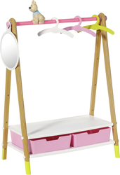 Psík Bello teraz pracuje pre módnu políciu. Z najvyššieho bodu stojanu na oblečenie doma stráži všetku módu pre BABY born a ostražito pozoruje nové modely. V zrkadle, ktoré možno zložiť, si môže malá parádnica prezrieť svoje outfity na sebe. Stojan na oblečenie v škandinávskom štýle má vzpery vo vzhľade dreva. Na ružovom priečnika sú zavesené tri farebné ramienka na šaty. Okrem odkladacieho miesta na polici ponúkajú veľa miesta na doplnky a ďalšie maličkosti dve ružové priehradky.