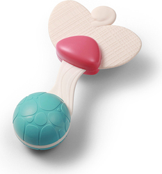 - Pri trasení hrkálka vydáva jemné zvuky, ktoré priťahujú pozornosť bábätka a rozvíjajú jeho sluch.