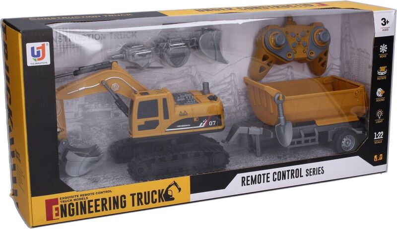 Frekvencia 2.4GHz. Svetelné, zvukové a dymiace efekty. Batériový pack 3.7V 500mAh Li-ion do bagru súčasťou, 2xAA do ovládača nie sú súčasťou. USB kábel súčasťou.
