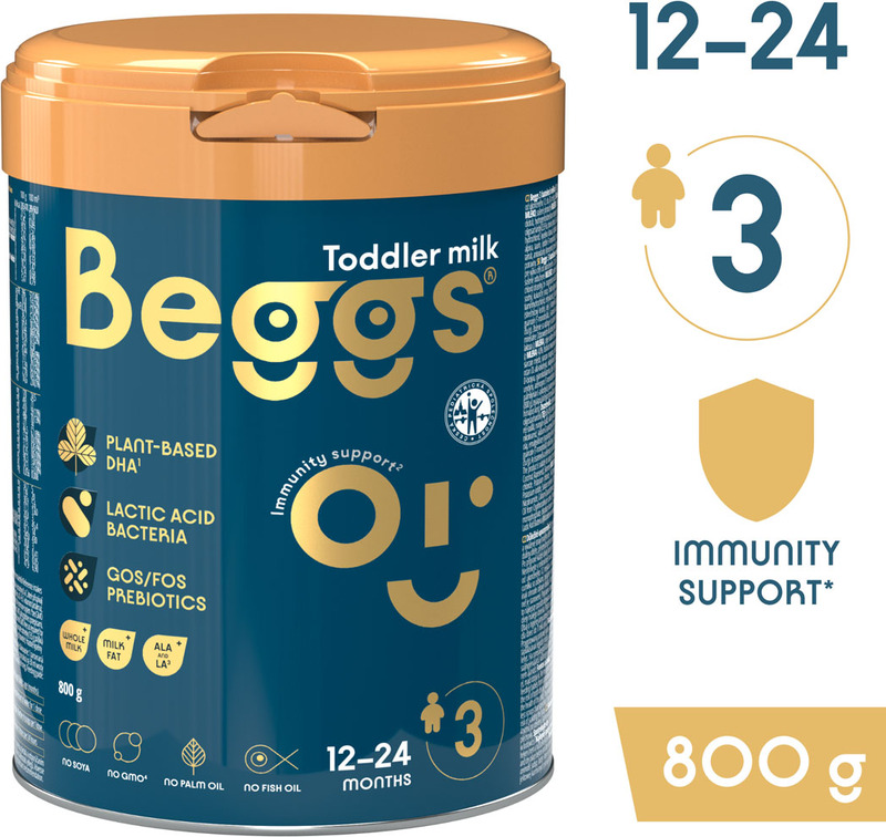 Dojčenské mlieko Beggs bolo vyvinuté v spolupráci s českými a slovenskými rodičmi. Obsahuje zmes probiotík a prebiotík GOS/FOS. Pridané vitamíny C a D podporia správnu funkciu imunitného systému. Je tiež obohatené o plnotučné mlieko s kvapkou mliečneho tuku. Je určené pre deti od ukončeného 12. mesiace do dvoch rokov.