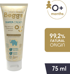Beggs Krém na zadoček je vhodný pre starostlivosť najmä v plienkovej oblasti. Pomáha chrániť a upokojiť pokožku a je šetrný k?citlivej a jemnej pokožke Vášho bábätka už od narodenia. Prírodné zloženie bez oxidu zinočnatého obsahuje aloe vera šťavu, ktorá podporuje hydratáciu pokožky, vyživuje ju a chráni. Ďalej obsahuje extrakt z?kvetov nechtíka lekárskeho, ktorý má zjemňujúce a zvláčňujúce účinky. Obe zložky pochádzajú z?kontrolovaného ekologického poľnohospodárstva (BIO) a 99,2 % zložiek v?balení je prírodného pôvodu.