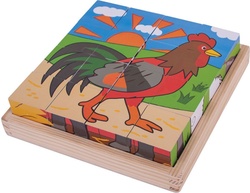 Šestnásť drevených kociek puzzle vytvára šesť rôznych obrázkov. Otočením každej kocky nájdite kúsky, ktoré vytvoria obrázok.