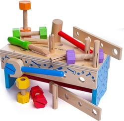 Tento šikovne navrhnutý drevený tesársky ponk obsahuje drevený kľúč, kladivo a množstvo skrutiek a matíc. Keď je čas všetko upratať, môžete ponk otočiť hore nohami a všetko do neho uložiť.