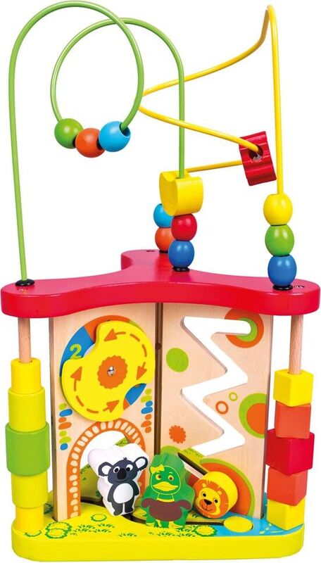Mnohostranný drevený labyrint s korálikmi zaujme deti pestrými farbami a množstvom herných prvkov. Na hračke sa nachádzajú koráliky rôznych tvarov a veľkostí, ktoré sa dajú posúvať po kovových dráhach, ako aj figúrky zvieratiek, ktoré možno premiestňovať. Okrem zábavy deti pri hre rozvíjajú jemnú motoriku, koordináciu rúk a očí a učia sa orientovať v priestore. Aktívne prvky navyše podporujú rozpoznávanie čísel, farieb a dennej doby, čím stimulujú ich poznávacie schopnosti.