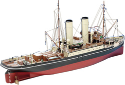 Po otvorení veka krabice nájdete laminátový trup s komínmi, drevené diely modelu z preglejky, sadu líšt, drobné súčasti a kovové odliatky vo vreckách, sadu výkresov a manuál.