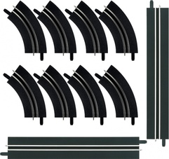 Set obsahuje napájací diel, mechanické počítadlo okruhov, 2x ovládač rýchlosti, 2x auto, zábrany, spojky dráhy, slovenský návod