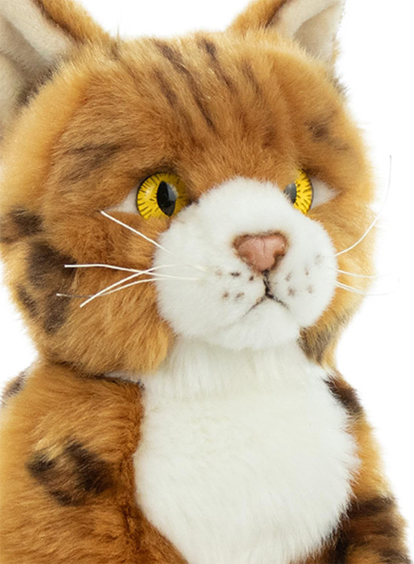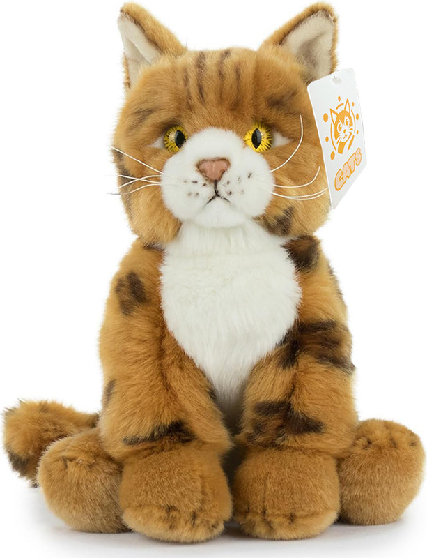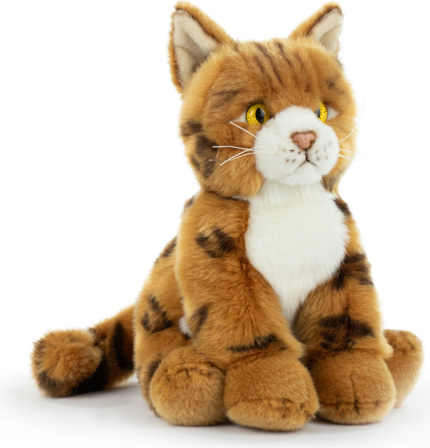 Plyšová bengálska mačka má hustú, medeno-hnedú srsť s výraznými tmavými pruhmi a kontrastnú bielu náprsenku, ktorá jej dodáva elegantný vzhľad. Svojím bacuľatým, sediacim postojom a veľkými, zlatožltými očami vyzerá mimoriadne bdelo a pripravene. Je to ideálny spoločník na maznanie, ktorý vyžaruje láskavú a šibalskú energiu.