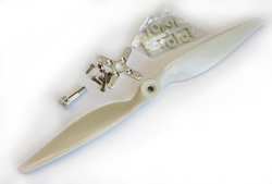 Vrtuľa elektro biely plast, rozmer 11x5.5 (279x140), otvor 6mm, priložené redukcia od priemeru 3mm. Priložený unášač vrtule na hriadeľ 3,5mm, závit M6. Hliníkový kríž s otvormi 2,5mm, rozstup 28mm.