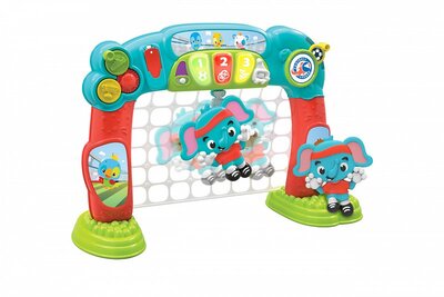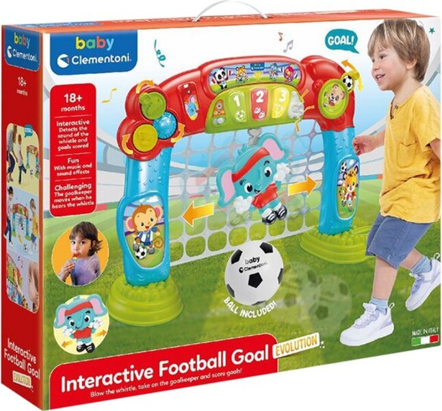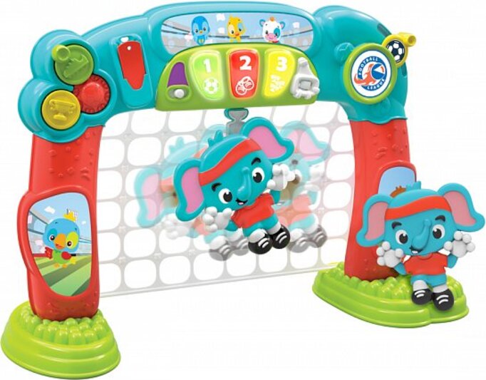 Futbalová bránka Clementoni s brankárom a aktivitami. Akonáhle sa ozve píšťalka, brankár sa začne presúvať z ľava doprava.