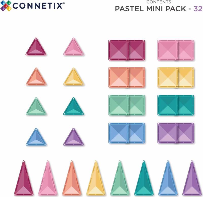 Prebuďte svoju predstavivosť a ponorte sa do STEAM učenia doma alebo na cestách s týmto dokonalým cestovným balením! Balenie CONNETIX 32 Piece Pastel Mini Pack s obsahom štvorcov, rovnoramenných trojuholníkov a rovnostranných trojuholníkov v zemitej pastelovej farbe je ideálnym úvodom do sveta CONNETIX!