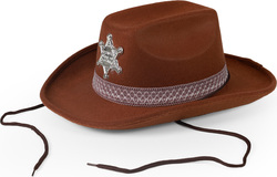 Štýlový kovbojský klobúk pre deti! Tento hnedý klobúk na gumičku je navyše zdobený stuhou a šerifskou hviezdou.