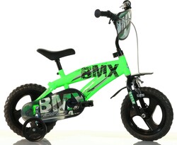 Detský bicykel Dino BMX 12", výrobca Dino Bikes Italy je športový bicykel pre malých závodníkov. Kolesá majú plastový ráfik s plnou pneumatikou, čo vylučuje možnosť defektu a zároveň zjednodušuje údržbu, nakoľko netreba kolesá dohusťovať. Bicykel má 1 prednú čelusťovú brzdu.Stredové zloženie má stály prevod, tzv. "furtšlap".