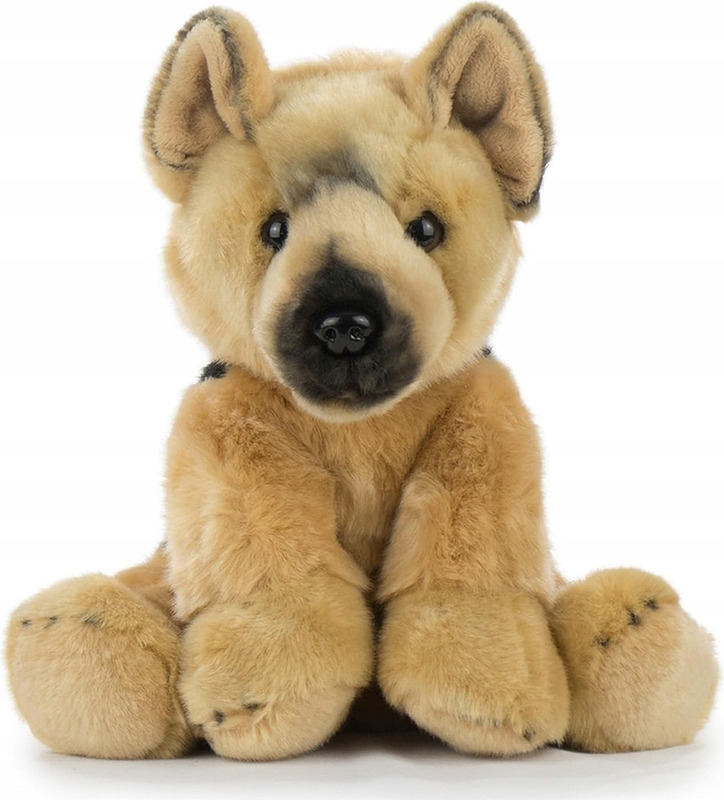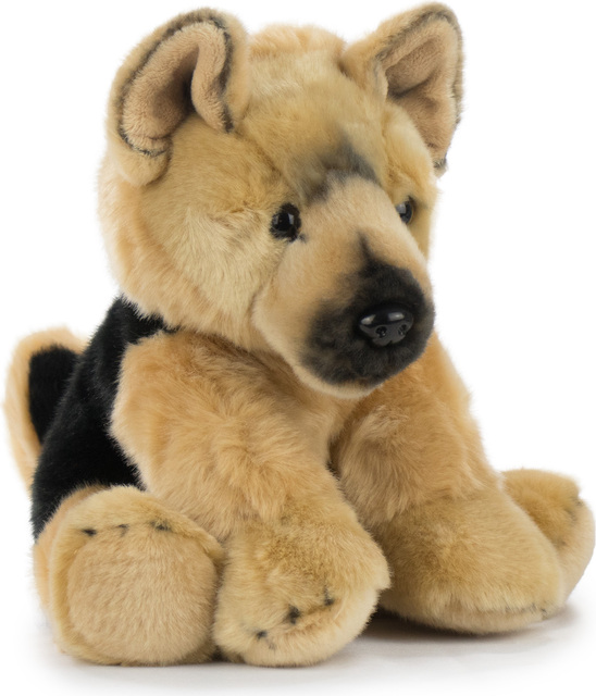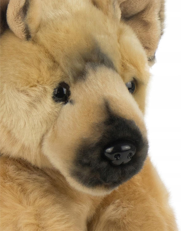 Plyšový psík Nemecký ovčiak má veľké, mäkké uši lemované čiernou farbou a bacuľaté labky, ktoré ho robia neodolateľne prítulným. Jeho srsť je v klasických odtieňoch béžovej a čiernej, pričom čierna srsť na chrbte pôsobí ako malý, ochranný kabát. Je v sediacej polohe a má sladký, zvedavý výraz s malým čiernym ňufákom, pripravený na hranie a maznanie.