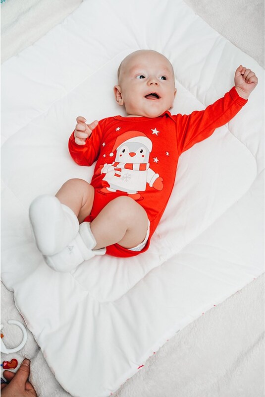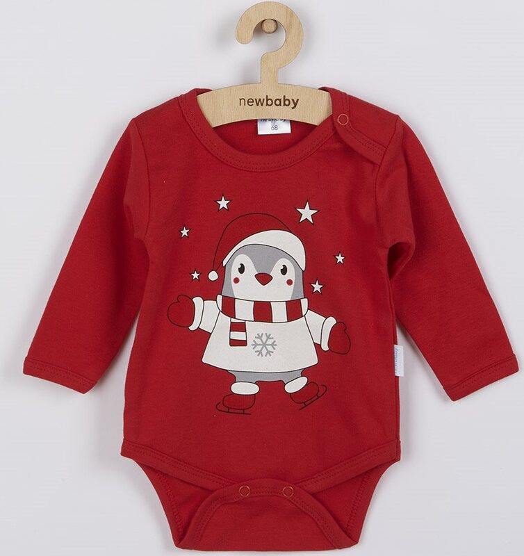 Body je v krásnej červenej farbe a je zdobené roztomilým a veselým tučniačikom. Zapínanie na cvočky na ramienku a medzi nožičkami uľahčuje obliekanie a prebaľovanie bábätka.