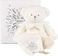 Plyšový medvedík je ideálnym darčekom pre deti už od narodenia. Súčasťou medvedíka je mäkučká dečka, ktorá je skvelá na maznanie a môže pomôcť bábätku ľahšie zaspať. Dečku je možné jednoducho schovať do bruška medvedíka, čo je praktické pri cestovaní alebo ukladaní. Je ozdobená jemnou výšivkou značky Doudou a saténovými stuhami s láskyplnými odkazmi vo francúzštine, ktoré dodávajú každému maznaniu ešte nežnejší pocit. Medvedík má štýlové ružové srdiečko na labke, roztomilý béžový golier pod krkom a hebké béžové labky, ktoré mu dodávajú nežný a priateľský vzhľad. Vďaka jemným, trendovým farbám a kvalitným, hebkým materiálom je ideálny pre malé deti, ktorým prináša pocit bezpečia a pohodlia. Perfektný tip na darček, ktorý poteší a zároveň stimuluje zmysly Vášho bábätka.