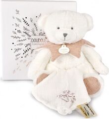 Plyšový medvedík je ideálnym darčekom pre deti už od narodenia. Súčasťou medvedíka je mäkučká dečka, ktorá je skvelá na maznanie a môže pomôcť bábätku ľahšie zaspať. Dečku je možné jednoducho schovať do bruška medvedíka, čo je praktické pri cestovaní alebo ukladaní. Je ozdobená jemnou výšivkou značky Doudou a saténovými stuhami s láskyplnými odkazmi vo francúzštine, ktoré dodávajú každému maznaniu ešte nežnejší pocit. Medvedík má štýlové ružové srdiečko na labke, roztomilý ružový golier pod krkom a hebké ružové labky, ktoré mu dodávajú nežný a priateľský vzhľad. Vďaka jemným, trendovým farbám a kvalitným, hebkým materiálom je ideálny pre malé deti, ktorým prináša pocit bezpečia a pohodlia. Perfektný tip na darček, ktorý poteší a zároveň stimuluje zmysly Vášho bábätka.