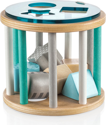- Drevená skladačka sa skladá zo 6 tvarov rôznych farieb, ktoré sa vkladajú do dreveného valca.