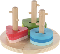 Farebné puzzle na okrúhlom podstavci z 3 dielov. Každá časť obsahuje drevenú tyč s výstupkami, na ktoré možno umiestniť drevené farebné tvary. Hračka rozvíja koordináciu, priestorovú predstavivosť a zručnosti rúk. Vďaka veľkému počtu možností skladania stimuluje detskú myseľ a podporuje kreatívne myslenie. Puzzle sú vyrobené z kvalitného dreva a farieb na vodnej báze.