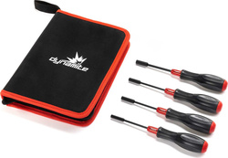 Súprava skrutkovačov, nástrčné metrické (4 ks), obsahuje nástrčné kľúče s rozmermi: 4mm, 5mm, 5.5mm a 7mm. Súprava od Dynamite je ergonomicky navrhnutá, má tvarovanú plastovú rukoväť s otočnou koncovkou pre pohodlné skrutkovanie. Puzdro na náradie s logom.