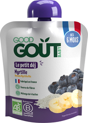 Zloženie: * banány 58,3 %, * čučoriedky 24 %, voda, * ryžová múka 1,3 %, * rastlinné oleje (slnečnicový s vysokým obsahom kyseliny olejovej, slnečnicový s vysokým obsahom kyseliny linolovej, repkový, ľanový) 1 %, * koncentrát štavy z citrónov. *z ekologického poľnohospodárstva. Bezgluténový.