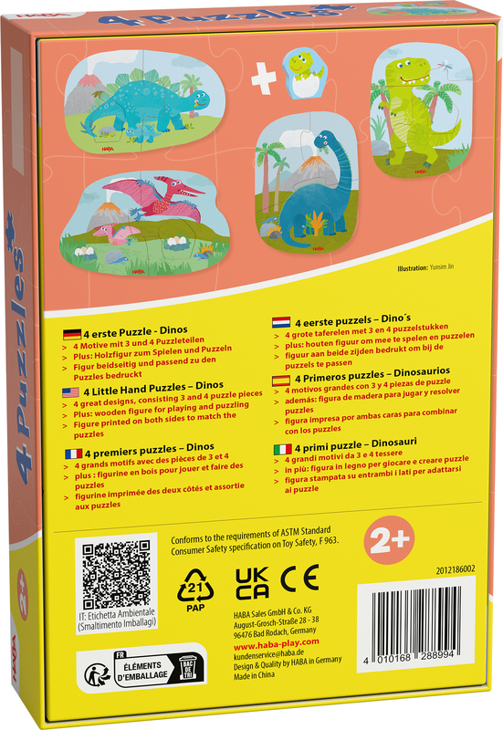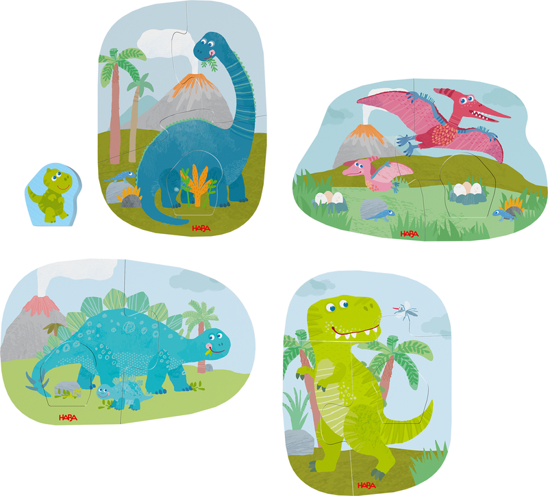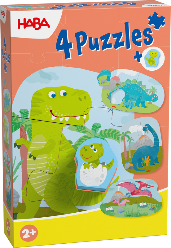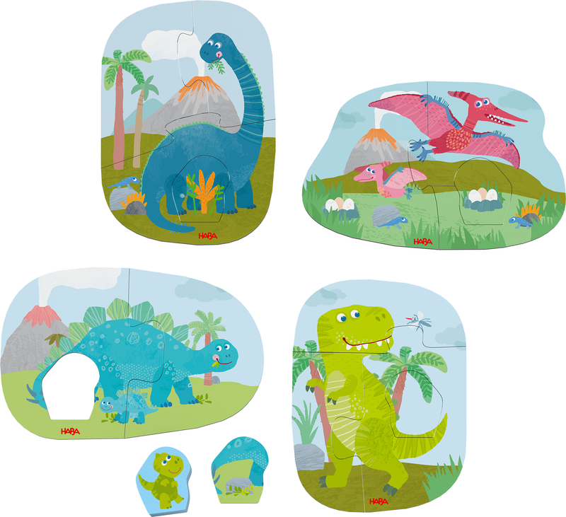 Sada 4 puzzle s drevenou figúrkou „Dinos“ je skvelým úvodom do skladania pre deti od 2 rokov. Veselé motívy dinosaurov prinášajú pri prvých pokusoch o skladanie veľa radosti.