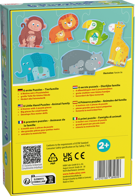 Sada 6 zábavných puzzle „Zvieracia rodinka“ je ideálnym začiatkom skladania pre malých milovníkov zvierat od 2 rokov. Každé puzzle sa skladá z 2 veľkých a pevných dielikov, ktoré sú dokonale prispôsobené malým detským rukám.