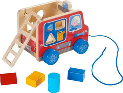 Súčasťou auta sú štyri farebné drevené kocky rôznych tvarov, ktoré deti vkladajú do správnych otvorov. Hasičské auto má aj výsuvný rebrík, ktorý dodáva hre nový rozmer zábavy a stimuluje detskú fantáziu. Stabilné kolieska a ťahacia šnúrka umožňujú malým hasičom voziť autíčko všade so sebou.