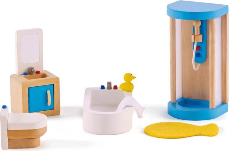 Drevený nábytok a doplnky do kúpeľne v domčeku pre bábiky obsahuje: