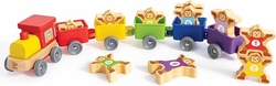Vláčik obsahuje lokomotívu, päť rôznych farebných oddielov pre vlak a 10 farebných drevených opíc.