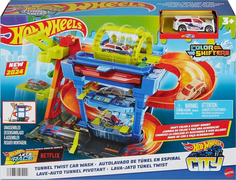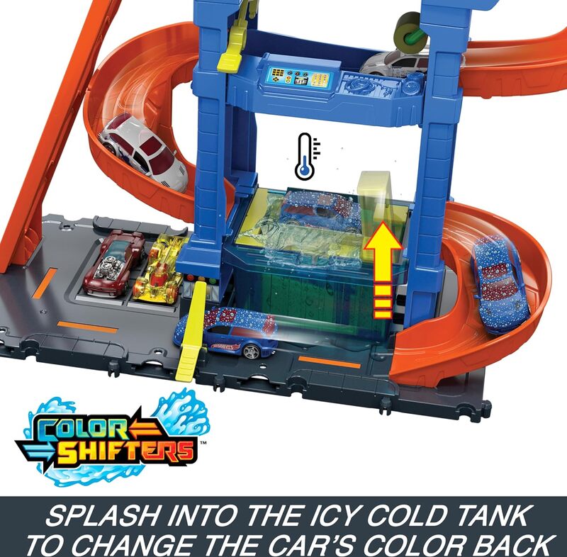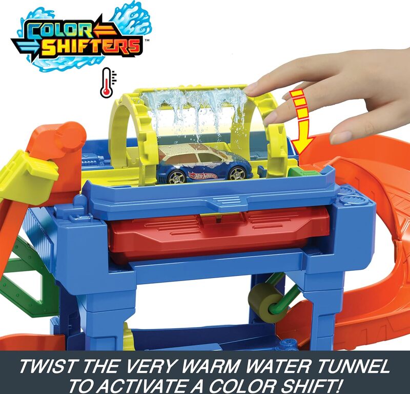 Objavte akčné dobrodružstvo v autodráhe Hot Wheels City Tunnel Twist! Táto súprava pridáva k zážitku zo zmeny farieb inovatívny prvok, ktorý obsahuje revolučný tunel striekajúci vodu.Deti môžu prevziať kontrolu nad autíčkom Hot Wheels Colour Shifter a prechádzať jednotlivými fázami tejto vzrušujúcej cesty. Zajazdite s autíčkom Hot Wheels Colour Shifter ku vchodu do práčovne, potom aktivujte výťah a vystúpte na najvyššie poschodie. Prejdi rotujúcim umývacím tunelom, kde horúca voda okamžite zmení vzhľad auta.