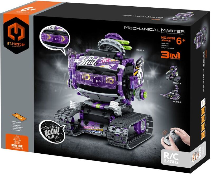Postavte si originálneho robota s čiapkou 3v1 zo stavebnice iM.Master. Model s rozmermi 17 × 16,6 × 20,6 cm sa skladá zo 458 dielikov a umožňuje zostaviť až tri rôzne varianty. Hotového robota môžete ovládať pomocou diaľkového ovládača alebo cez mobilnú aplikáciu (iOS/Android) vďaka pripojeniu cez Bluetooth 2,4 GHz. Stavebnica navyše ponúka svetelné a zvukové efekty pre ešte väčší zážitok z hry.