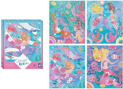Táto kreatívna sada obsahuje 4 obrázky s holografickými striebornými prvkami na tému oceán, ktoré je možné namaľovať paletou akvarelových farieb a 1 pero s vodným štetcom s nádržkou.