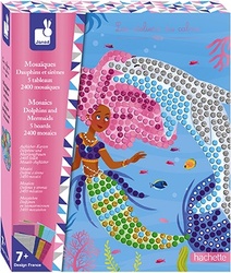 Kreatívna sada na tvorenie Mozaika Delfíny a Morské panny Janod Atelier Maxi obsahuje 5 kariet s krásnymi motívmi a 10 hárkov papierov s farebnou mozaikou.