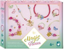 Kreatívna súprava na výrobu šperkov francúzskej víly značky JANOD vám umožní vytvoriť celkom až 6 kusov ozdôb: náhrdelník, 3 náramky a 2 prstene. Jeho súčasťou je mnoho korálikov v rôznych tvaroch a farbách (m.in. v tvare motýľov), rovnako ako svetlo zelený povrázok, biela elastická niť a 3 kovové prívesky-motýle.