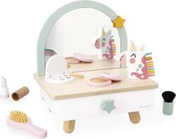 Drevený kozmetický stolík Janod Jednorožec je nádherný doplnok pre malé parádnice, ktoré milujú svet krásy a fantázie. Tento elegantný stolík s magickým jednorožcovým motívom obsahuje zrkadlo a množstvo doplnkov na hranie, vďaka čomu deti rozvíjajú kreativitu a jemnú motoriku.