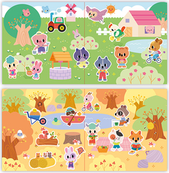 Sada obsahuje hárok s 22 hrubými nálepkami vrátane: zvieratiek na bicykloch, v člne, v traktore alebo s šarkanom. Nálepky sú odolné a opakovane použiteľné. Dieťa nimi môže dosky zdobiť mnohokrát, takto prezentované príbehy voľne obmieňať.