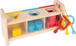 - Ďalej sa dieťa môže učiť vkladať, poznávať farby, tvary alebo počítať. Táto hra je vyrobená z masívneho dreva a obsahuje tri rôzne zámky na otvorenie.