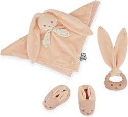 Kaloo Lapinoo Darčeková sada pre bábätko s hrkálkou hryzátkom a capačkami broskyňová