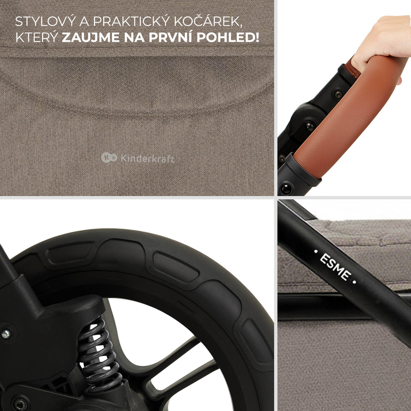 Kočík 3 v 1 ESME má aj veľké odpružené kolesá z neprepichnuteľnej TPE gumy – sú ľahké, otočné a vhodné do každého terénu. ESME vás spoľahlivo sprevádza na každodenných prechádzkach aj na dlhších dovolenkách.
