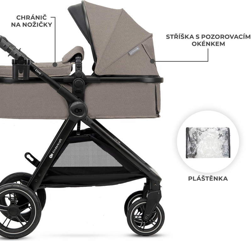 Kočík 3 v 1 ESME má veľkú striešku s okienkom pre kontakt s dieťaťom, ktorá chráni pred vetrom aj slnkom. Pod sedadlom sa nachádza priestranný košík s nosnosťou až 3 kg – ideálny na nákupy alebo nevyhnutné doplnky. O bezpečnosť dieťaťa sa starajú nastaviteľné 5-bodové pásy s mäkkými polstrami a odnímateľné madlo, ktoré možno otvoriť z oboch strán.