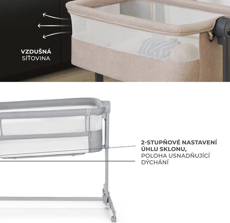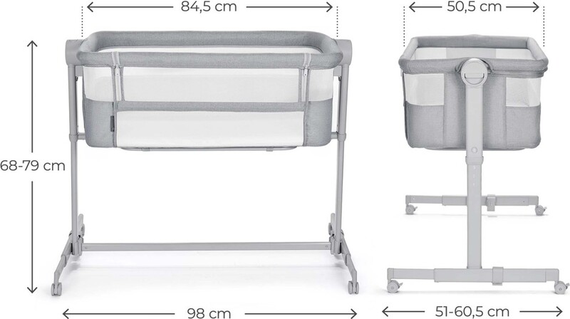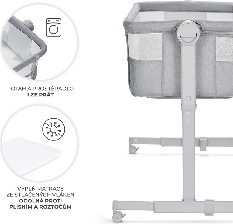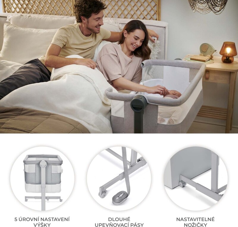 Plynulé a jednoduché nastavenie výšky postieľky umožňuje bez námahy prispôsobiť prístelku výške postele rodiča. Nastavte ju na jednu z 5 úrovní, nastavte nohy v takej vzdialenosti, aby postieľka presne priliehala k posteli, a pripevnite ju pomocou špeciálnych popruhov, aby ste vytvorili bezpečný priestor na spanie pre vaše dieťa.
